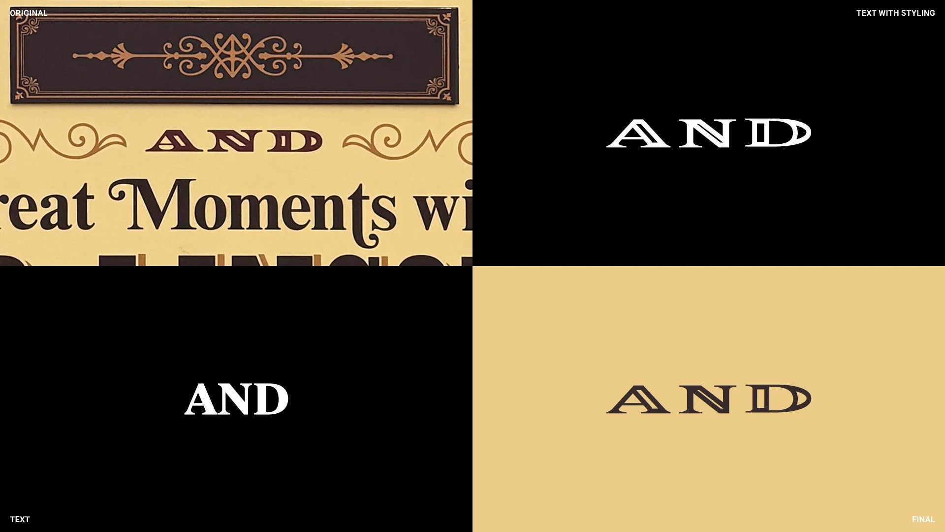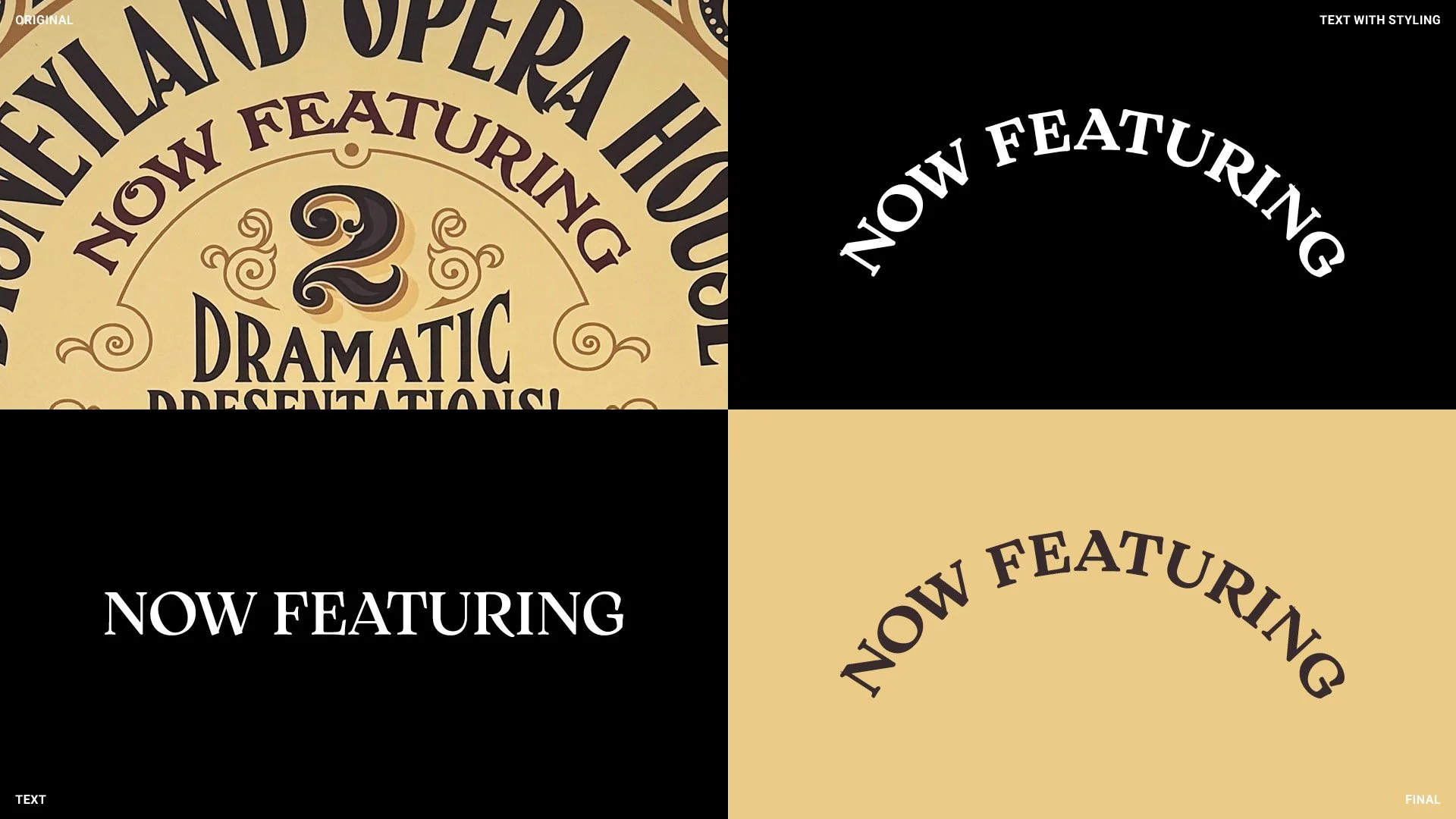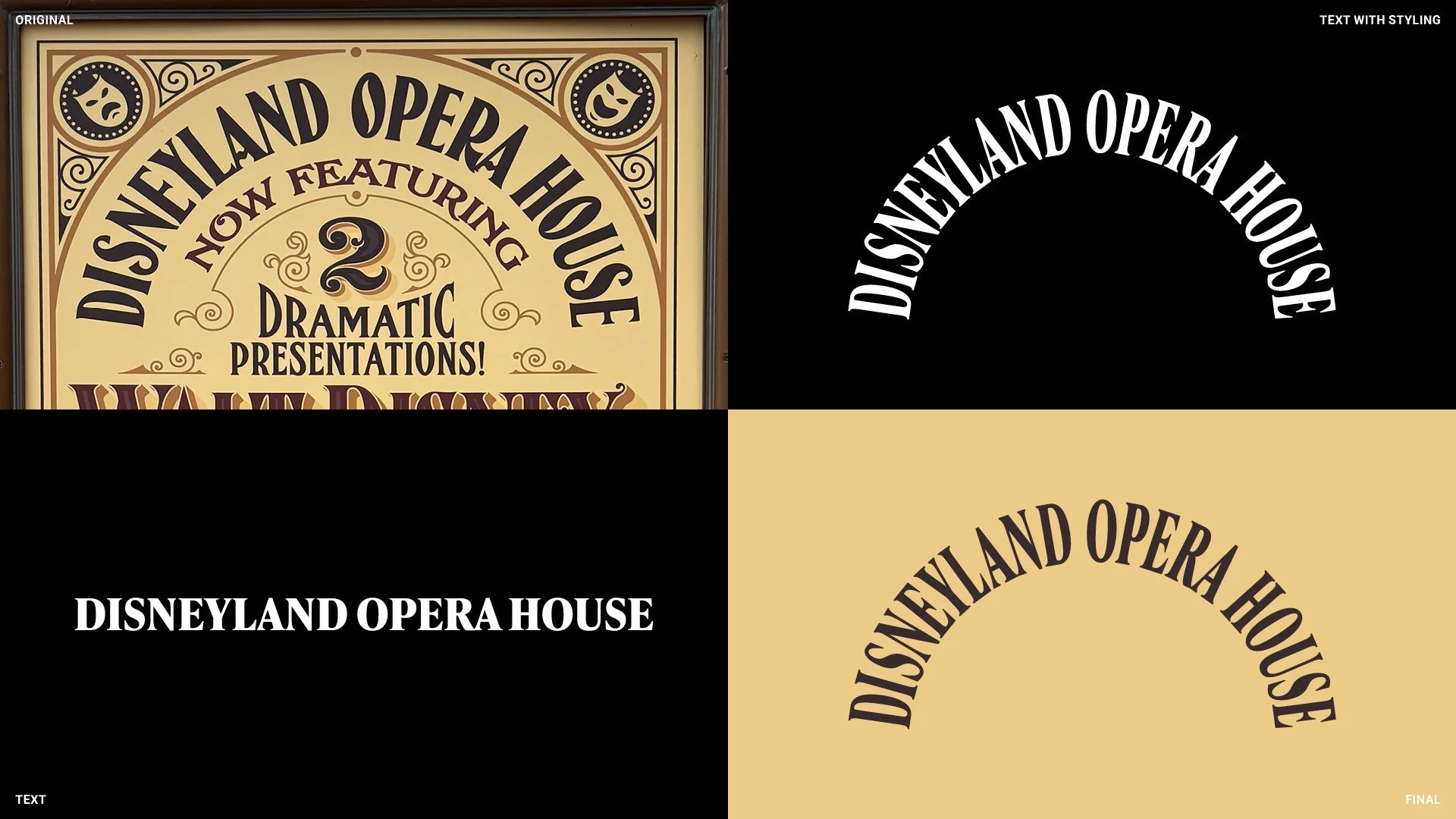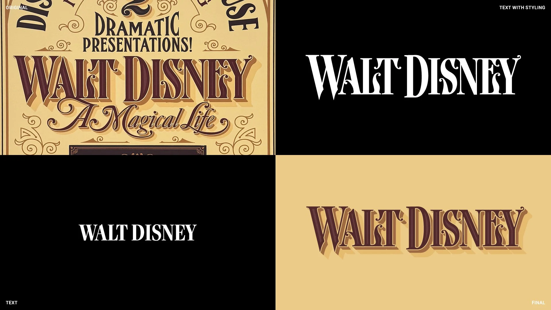 On top of that, modern type libraries (Adobe, Google) lean heavily toward cleaner, more contemporary serifs. That made it tricky to find authentic “old-style” serifs, like the one used in Now Featuring, which has such distinct personality. Matching the ornate Walt Disney and A Magical Life type was even harder. The “Walt Disney” wordmark feels like a unicorn — maybe even custom. And the swashy serif for A Magical Life? Let’s just say I had to get creative.