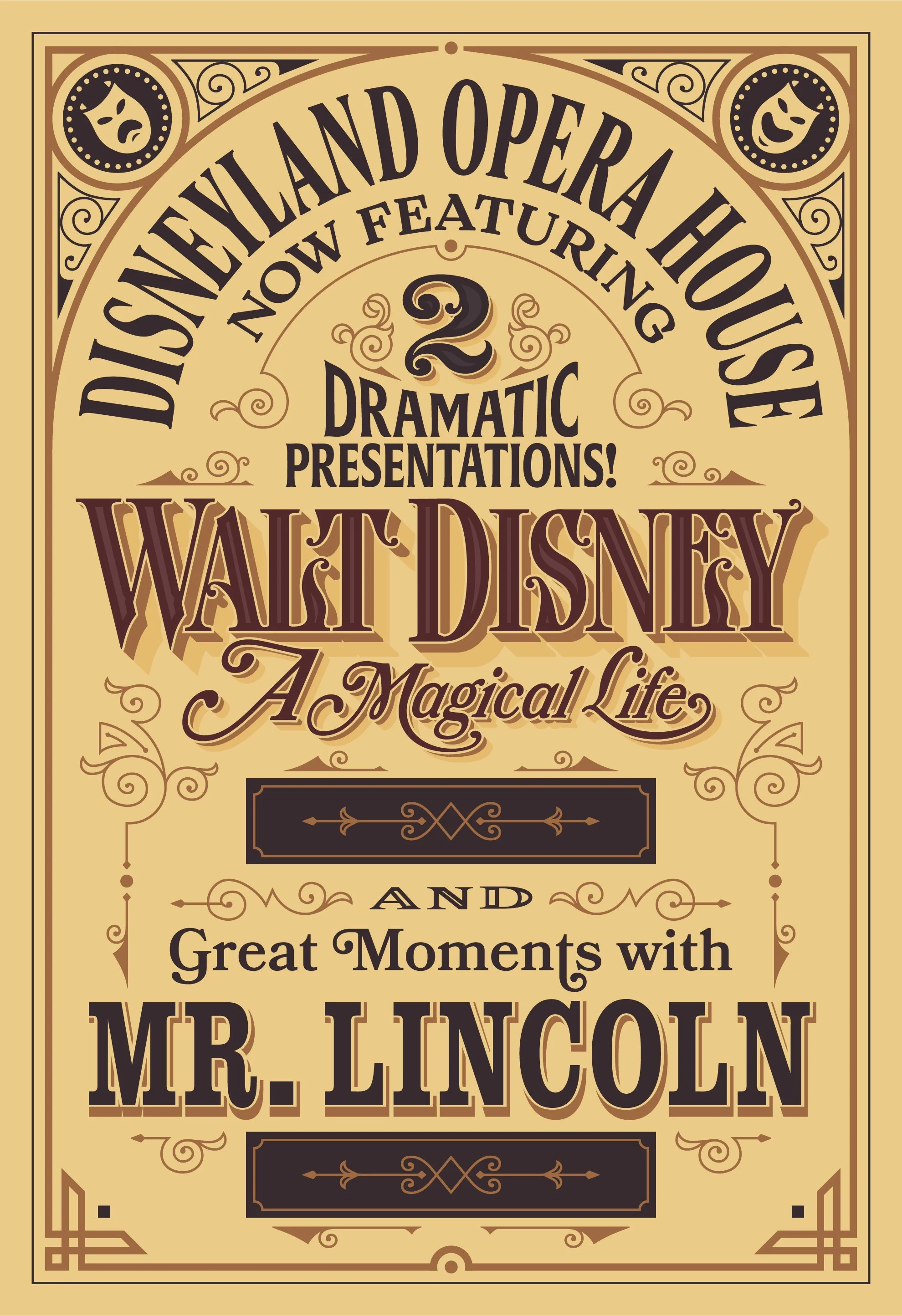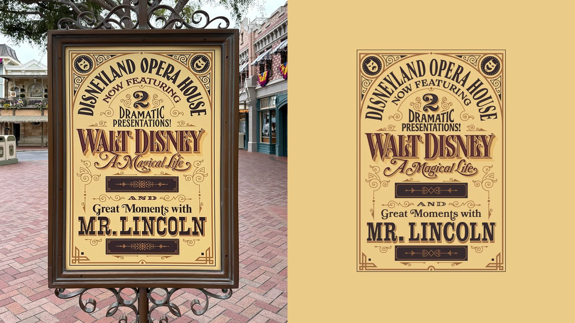 With the recent reopening of the Disneyland Opera House, I decided to recreate one of the new attraction signs. At first, I planned on tackling the large, beautiful blue marquee above the entrance — but just a few steps away I spotted something even more interesting: a free-standing sign for Walt Disney – A Magical Life and Great Moments with Mr. Lincoln.