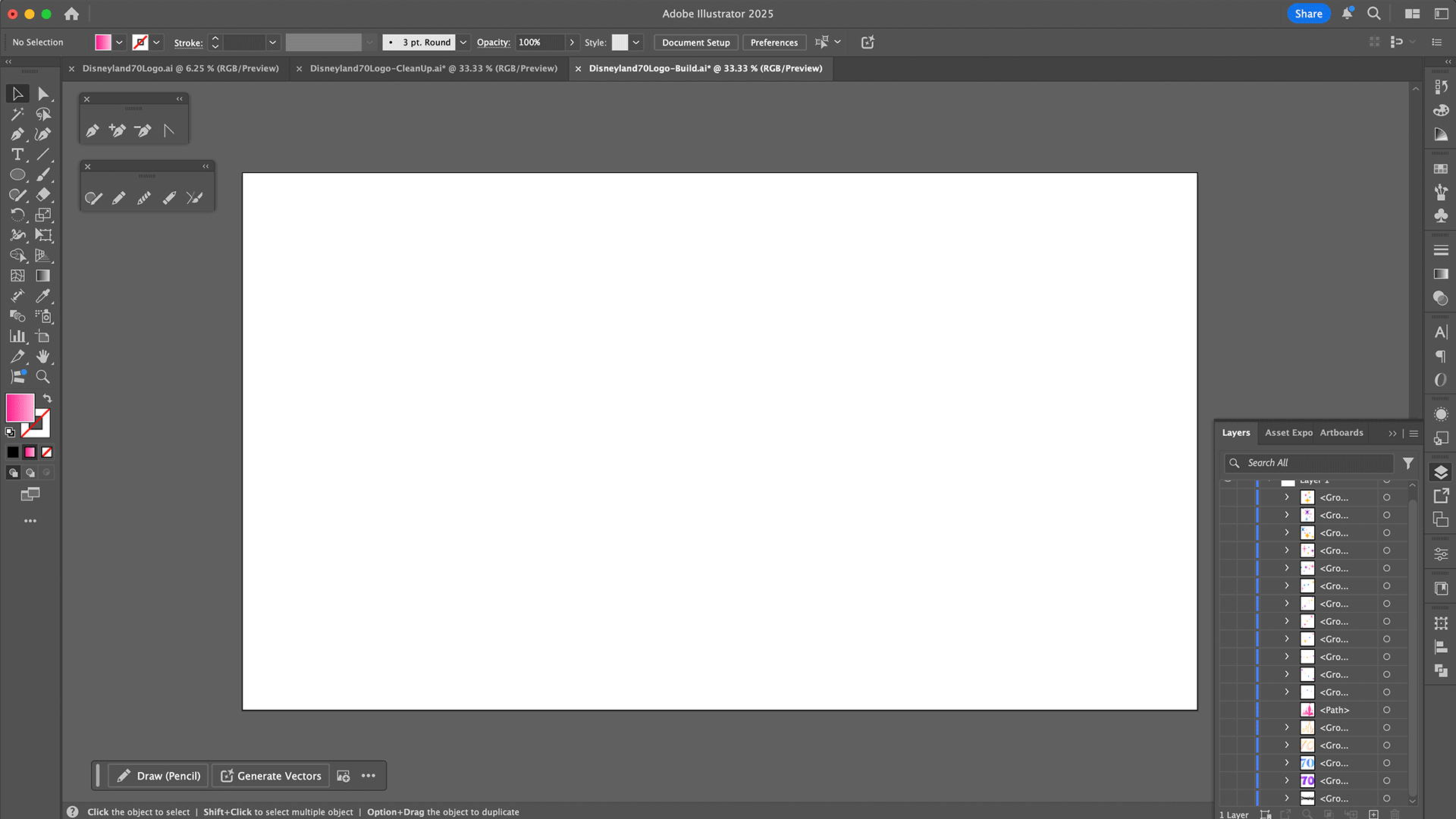 The recreation for the base of this logo was fairly straightforward. When I really studied it a few months ago, I noticed it’s essentially a simple layered vector: three different styles of “70” stacked on top of each other. The castle sits neatly above, its base shaped to curve around the “70.” And of course, in classic Disney fashion, no logo is complete without sparkles and stars. The shapes here (four- and six-point stars, diamonds, and circles) lean toward a mid-century ’50s style, which makes sense given that this anniversary branding was designed to celebrate Disneyland’s origins in that era.